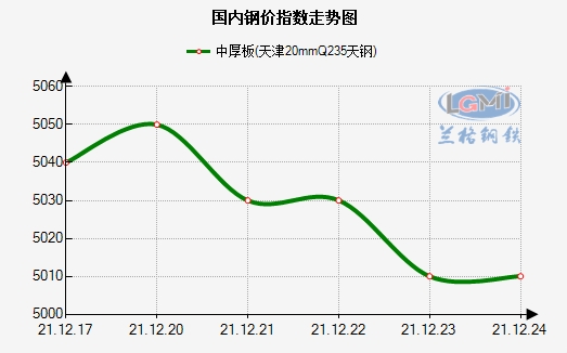 上周(12.20-12.24),天津中厚板价格震荡下行,后市行情并不看好。从图中可以看出,周初20mmQ235天钢价格报5040元/吨(锰板加230-240元左右),截至发稿,本地中板价格降至5010元/吨,价差30元,与上周五价格持平。