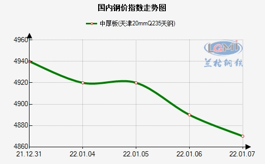 本周(12.31-1.7),天津中厚板市场价格宽幅下行,后期市场仍不看好。据兰格云商平台监测数据显示,截至1月7日,天津地区20mmQ235天钢价格报4860元/吨,与上周五(12月31日)价差80元。