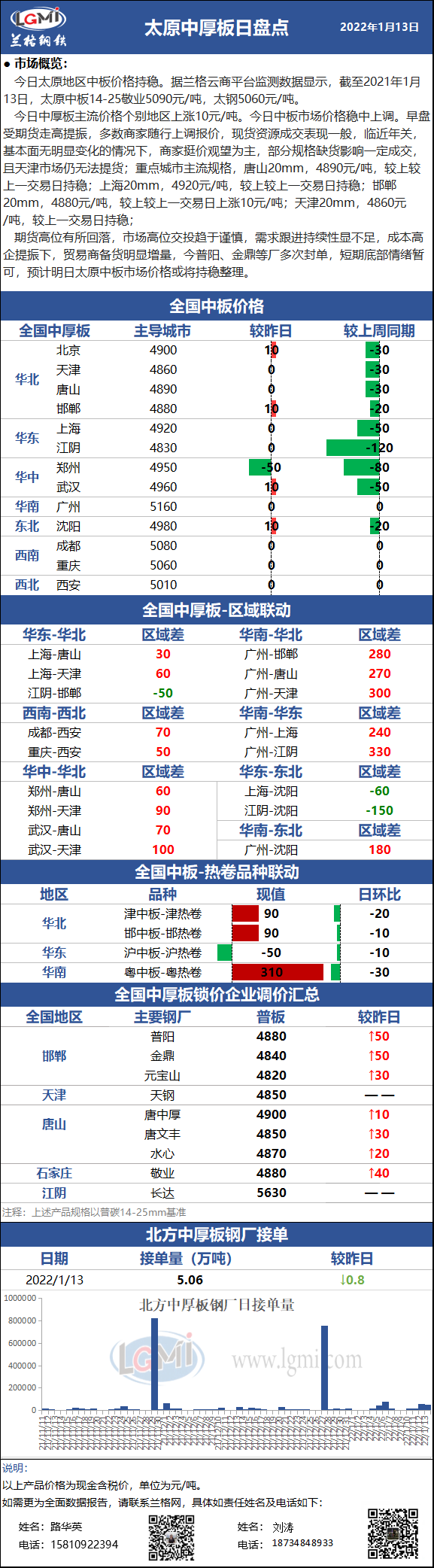 - 1月13日太原中厚板价格小幅上涨 明日或持稳整理2022/1/13