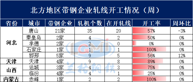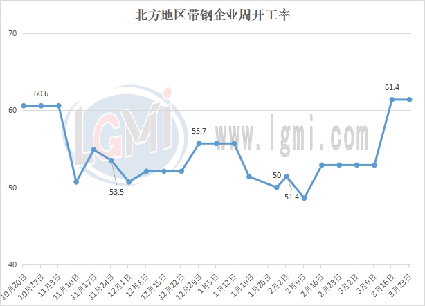 据兰格云商调研监测:本周(3月23日)兰格网对北方地区43家带钢企业进行了开工情况调查,调查显示,北方地区带钢轧机共有70个,本周在开工轧线43条,本周开工率为61.4%,较上周持平。其中非调坯带钢轧机有62个,本周在开工轧线39条,本周开工率为62.9%,较上周持平。调坯带钢轧机7个,本周在开工轧线4条,本周开工率为57.1%。
