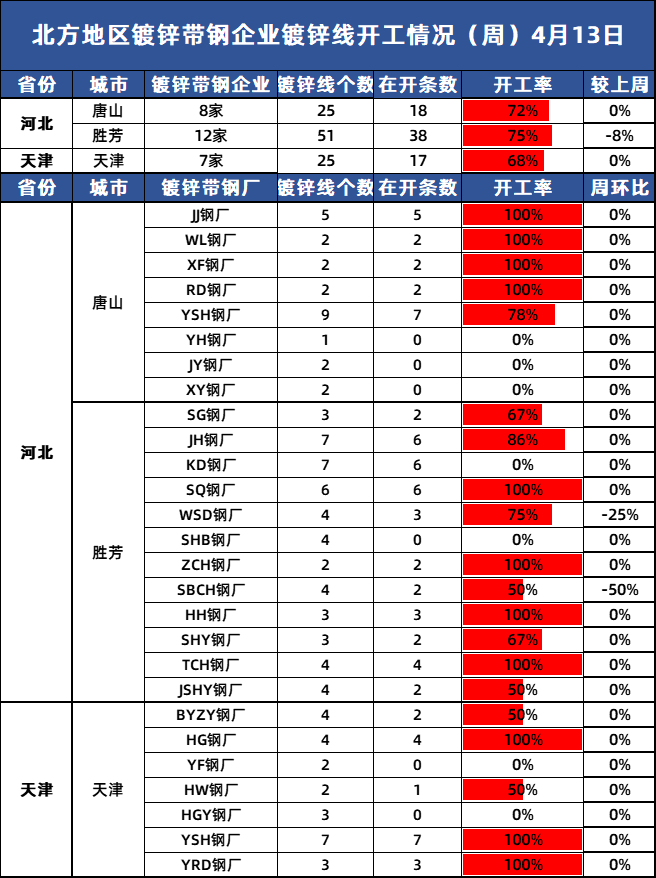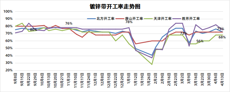 据兰格云商调研监测:本周(4月13日)兰格网对北方地区27家镀锌带钢企业进行了开工情况调查,调查显示,北方地区27家样本镀锌带钢企业中镀锌线共有101条,在开线73条,开工率为72.28%,较上周下降3.96%。