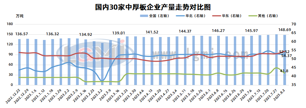 兰格调研:截至8月3日,据兰格云商平台监测数据显示,全国中厚板钢厂周产量148.69万吨,比上周同期减少2.1万吨。