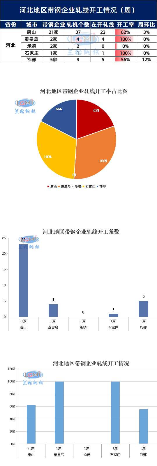 据兰格云商调研监测:本周(8月10日)兰格网对河北地区31家带钢企业进行了开工情况调查,调查显示,河北地区带钢轧机共有53个,本周在开工轧线33条,开工率为62%,较上周上升4%。其中唐山地区有轧机37个,本周在开工轧线23条,开工率为62%,较上周上升3%。邯邢地区有轧机9个,本周在开工轧线5条,本周开工率为56%,较上周上升12%。秦皇岛地区开工率为100%,较上周持平,承德、石家庄地区轧机有3个,本周在开1条。