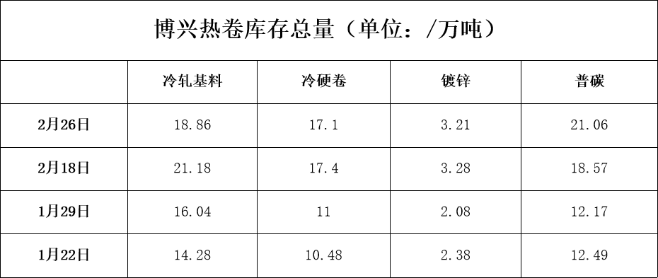 据兰格云商平台监测数据显示,截止2月26日博兴各仓库冷轧基料库存约为18.86万吨,较上期减少2.32万吨;冷硬卷库存17.1万吨,较上期减少0.3万吨;镀锌彩涂库存3.21万吨,较上期减少0.07万吨。