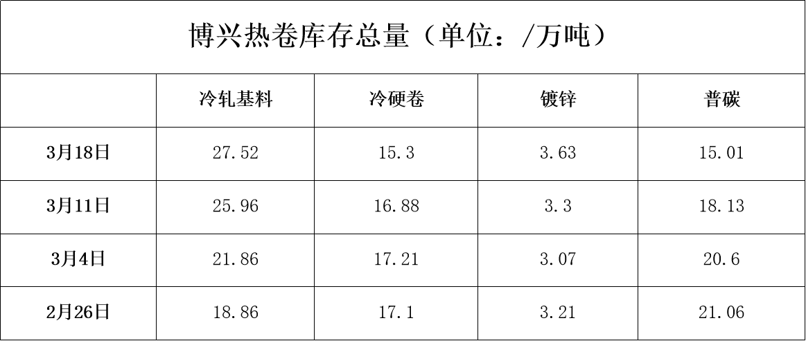 据兰格云商平台监测数据显示,截止3月18日博兴各仓库冷轧基料库存约为27.52万吨,较上期增加1.56万吨;冷硬卷库存15.3万吨,较上期减少1.58万吨;镀锌彩涂库存3.63万吨,较上期增加0.33万吨。