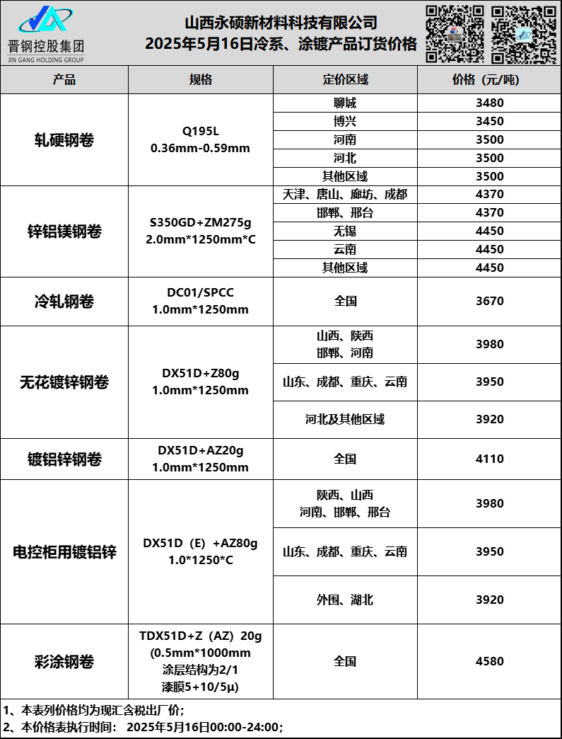 • 5月16日山西晋钢冷系 涂镀产品订货价格