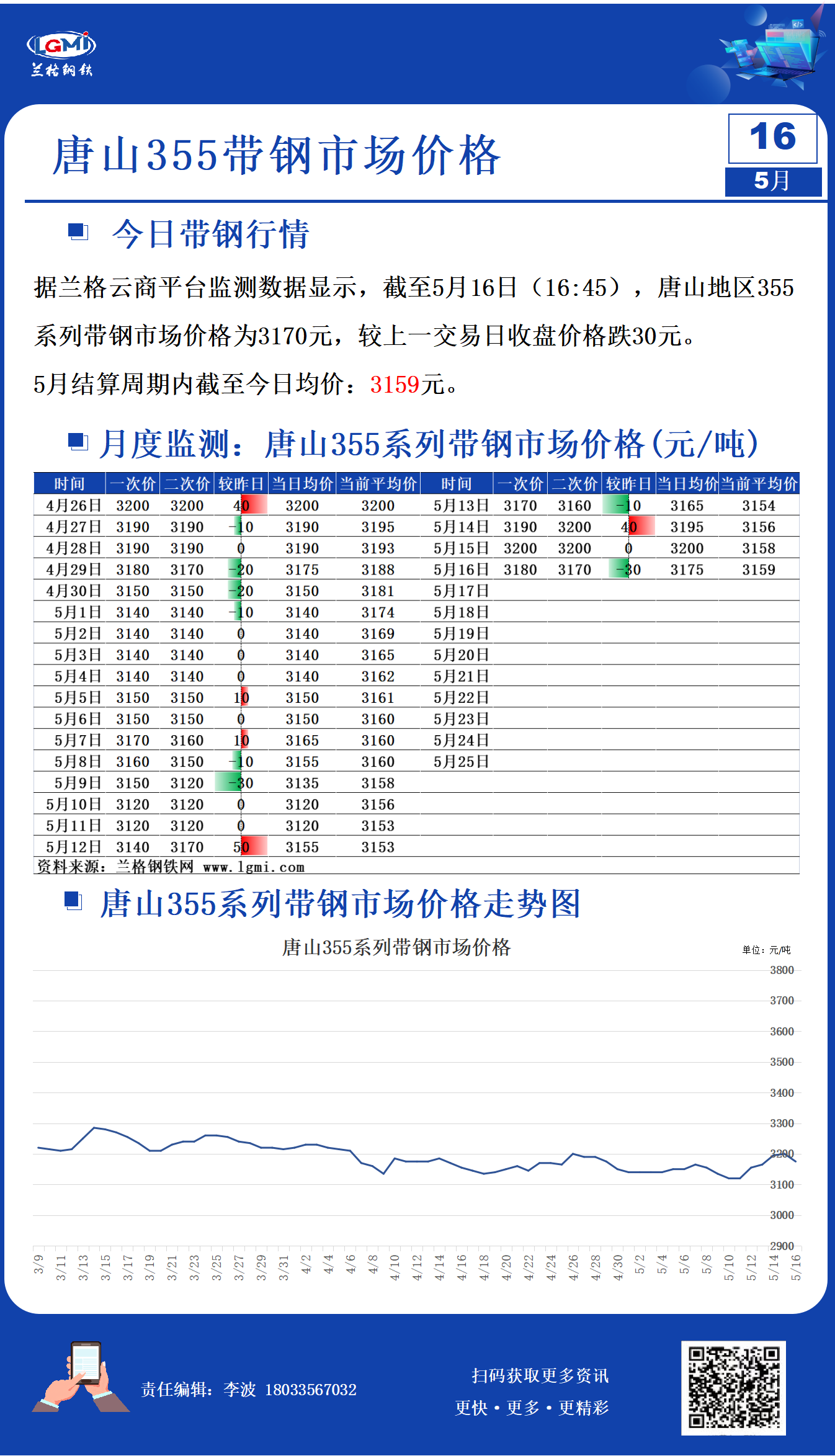 • 5月15日唐山带钢宝生145-252系出厂价下调10元
