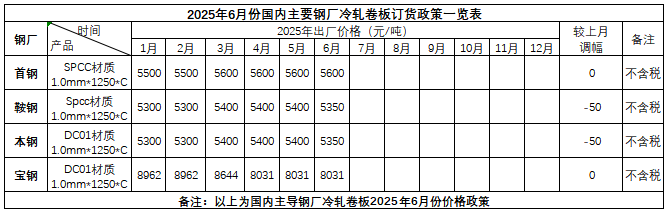 2025年6月份国内主要钢厂冷轧板卷订货政策