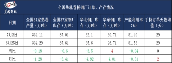 截止7月2日,兰格钢铁网监测的全国热卷钢厂主要指标显示,本周国内热卷产量及库存量均有不同程度下降。追踪国内37家热卷企业本周热卷总产量约334.11万吨,环比上周同期窄幅减少0.18万吨;热卷轧线产能利用率81.49%,环比上周下浮0.04个百分点;样本钢厂库存量约为87.01万吨,环比上周下降0.6万吨。 目前手持订单情况总体表现为良,长协订单29天,环比上周持平:一线企业手持订单天数保持在30天左右,二线企业基本保持在15-25天。(指标评价-良)。 注:评价指标,仅代表兰格根据关联指标给出的市场晴雨表推荐参考,分优、良、一般、低,四个档位。