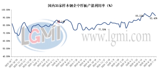 注:评价指标,仅代表兰格根据关联指标给出的市场晴雨表推荐参考,分优、良、一般、低,四个档位。 以下为具体指标表现情况: 7月16日,全国中厚板35家样本企业周产量为165.90万吨(44家新样本钢厂周产量为199.8万吨),环比上周同期减少3.70万吨,轧线产能利用率为92.40%,环比上期下降2.06个百分点,截止目前样本钢厂19条轧线未满产,5条轧线处于停产状态。本周轧线开工小幅降低,因部分短流程钢企轧线停产,市场供应资源有所减少,但主要在普碳,低合金资源供应充足。