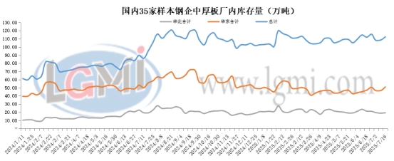 7月16日,全国中厚板35家样本钢厂库存总量为112.42万吨(44家新样本钢厂库存总量为119.1万吨),环比上周同期增加3.92万吨,其中华北12家钢企中厚板厂库为19.3万吨,环比上期增加0.5万吨;华东12家钢企中厚板厂库为50.9万吨,环比上周同期增加4.4万吨。本周钢企总库存有所增加,因市场需求偏弱,资源较为充足,近期贸易商提货速度有所放缓,北方库存相对变化较小,南方增量明显,贸易企业大多延续“低库存、高流转”理念。