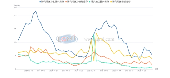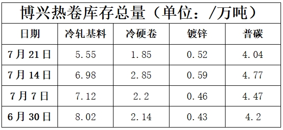 据兰格云商平台监测数据显示,截止7月21日博兴各仓库冷轧基料库存约为5.55万吨,较上期减少1.43万吨;冷硬卷库存1.85万吨,较上期减少1.00万吨;镀锌彩涂库存0.52万吨,较上期减少0.07万吨。