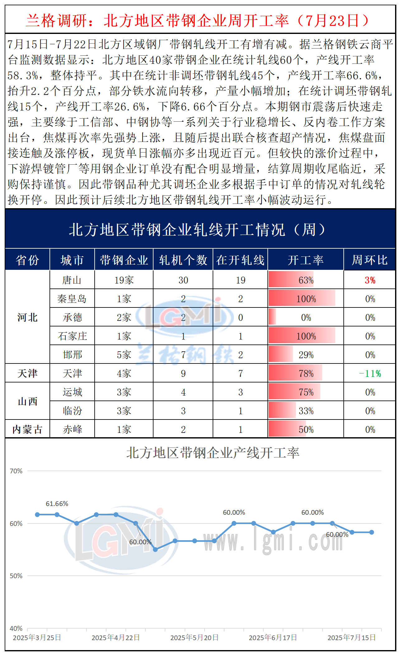 兰格调研:北方地区带钢企业周开工率(7月23日)