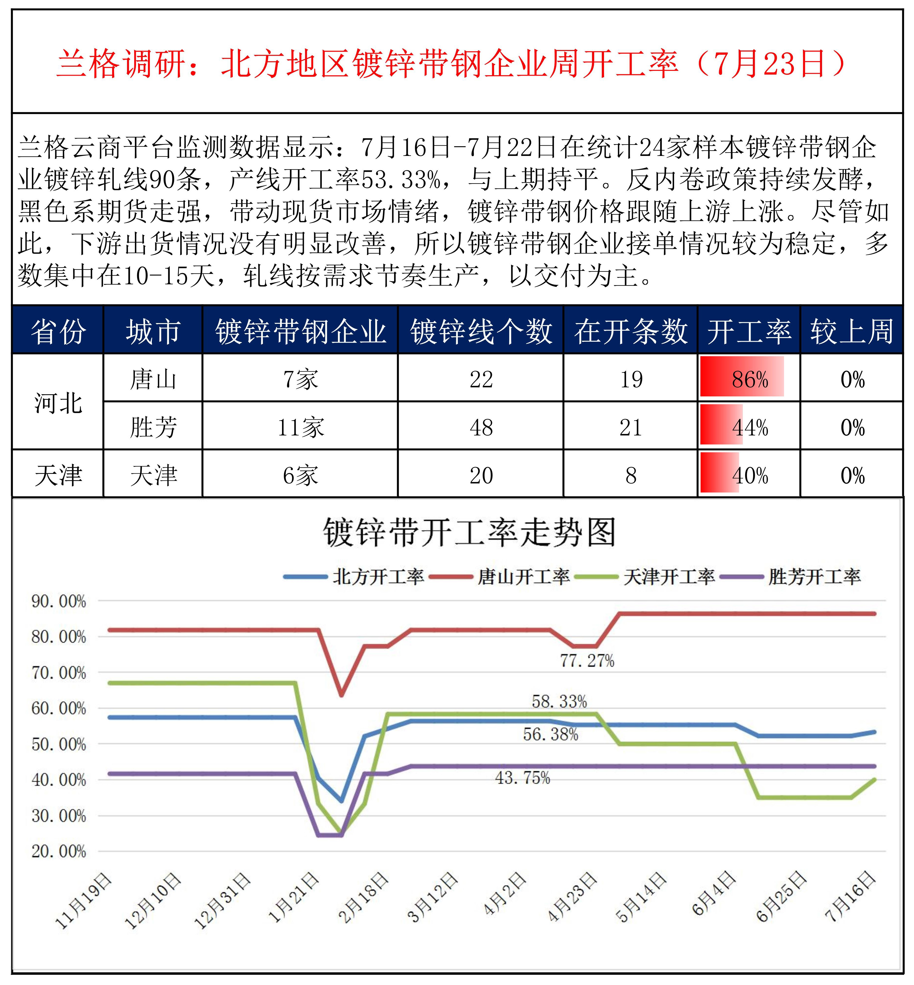 • 兰格调研:北方地区镀锌带钢企业周开工率(7月23日)