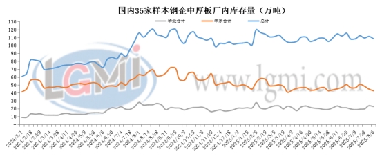 8月6日,全国中厚板35家样本钢厂库存总量为108.62万吨(44家新样本钢厂库存总量为115.4万吨),环比上周同期减少2.8万吨,其中华北12家钢企中厚板厂库为22.8万吨,环比上期减少1万吨;华东12家钢企中厚板厂库为42.60万吨,环比上周同期减少2.2万吨。本周钢企库存有所降低,上周台风影响钢企发货速度,而本周钢企加速发货,补充上周缺口,故库存表现减少。