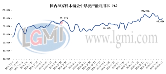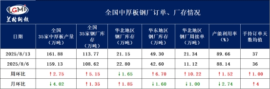 注:评价指标,仅代表兰格根据关联指标给出的市场晴雨表推荐参考,分优、良、一般、低,四个档位。 以下为具体指标表现情况: 8月13日,全国中厚板35家样本企业周产量为161.88万吨(44家新样本钢厂周产量为198.21万吨),环比上周同期增加2.75万吨,轧线产能利用率为89.66%,环比上期上升1.52个百分点,截止目前样本钢厂19条轧线未满产,5条轧线处于停产状态。本周中厚板市场需求有所释放,贸易商接单情绪增加,外加前期钢企生产品种钢较多,流通材产量相对较少,部分市场资源偏紧,部分钢厂结合订单和市场资源情况加大生产力度,虽轧线未有新增重启情况,但部分产量增多,轧线开工率表现上升。