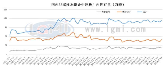 8月13日,全国中厚板35家样本钢厂库存总量为113.77万吨(44家新样本钢厂库存总量为115.4万吨),环比上周同期增加5.15万吨,其中华北12家钢企中厚板厂库为21.15万吨,环比上期减少1.65万吨;华东12家钢企中厚板厂库为49.30万吨,环比上周同期增加6.70万吨。本周钢企库存有所增多,北市场需求有所好转,贸易商接单情绪增加,库存微减;南方长流程钢企品种钢接单相对较多,待提库存量较大,故钢厂库存表现增加。