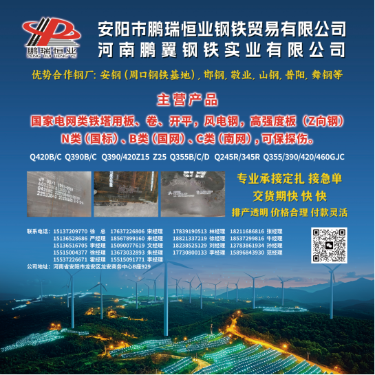 安阳市鹏瑞恒业钢铁贸易有限公司,河南鹏翼钢铁实业有限公司,公司坐落于交通便利环境优美的甲骨文故乡,中原文明中心河南省安阳市。为安阳钢铁集团有限责任公司、河南安钢周口钢铁有限责任公司、河钢集团有限公司代理商、山东钢铁集团日照有限公司、河北敬业钢铁有限公司等钢厂一级代理商。主要经营风电钢(国网南网)、高强板(国网南网)、高强卷Q420整卷及零开,Q355C/D整卷及零开、低合金/高强板Z向板、电力铁塔专用钢、锅炉容器板、高建钢等优质钢材!另有江阴长景钢厂Q235B6/8/10/12,宽度2000/2200/2500,常年备有现货2000吨。并可根据用户需求定做各种产品,切割加工,双定尺,期货定轧,价格低,交货快!