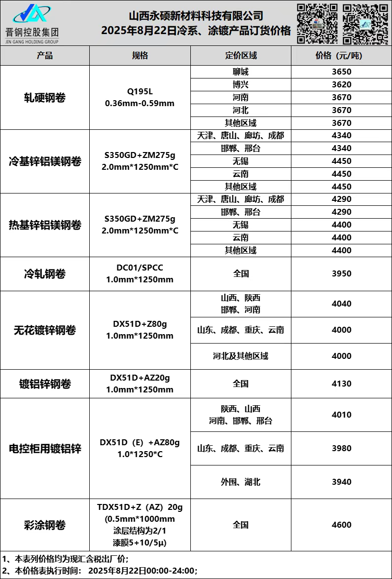 • 8月22日山西晋钢冷系 涂镀订货价格