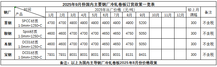 • 2025年9月份国内主要钢厂冷轧板卷订货政策