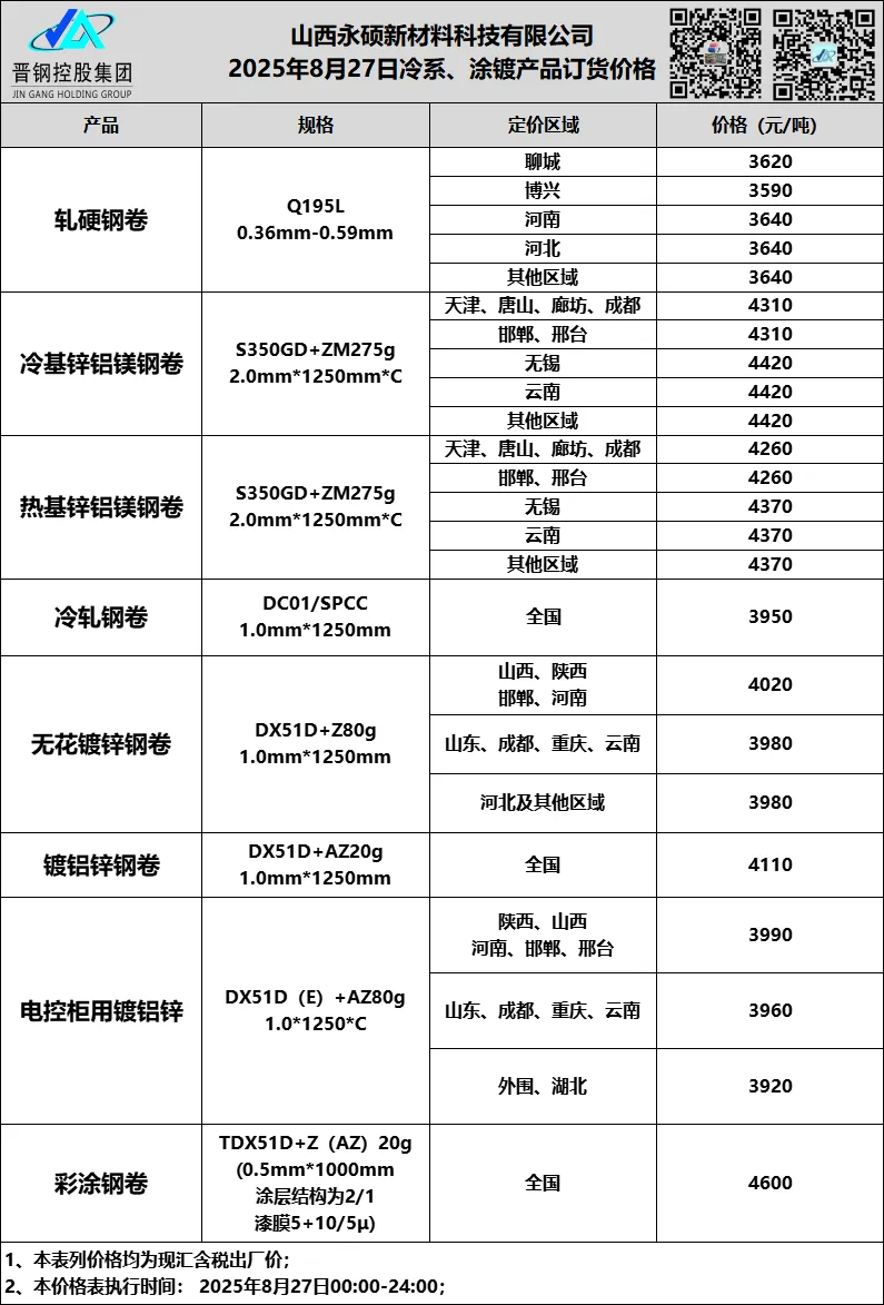 • 8月27日山西晋钢冷系 涂镀订货价格