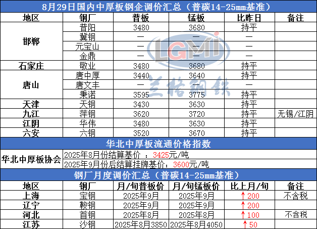 • 8月29日国内中厚板钢企调价汇总