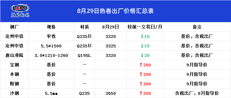 • 8月29日热卷出厂价格汇总