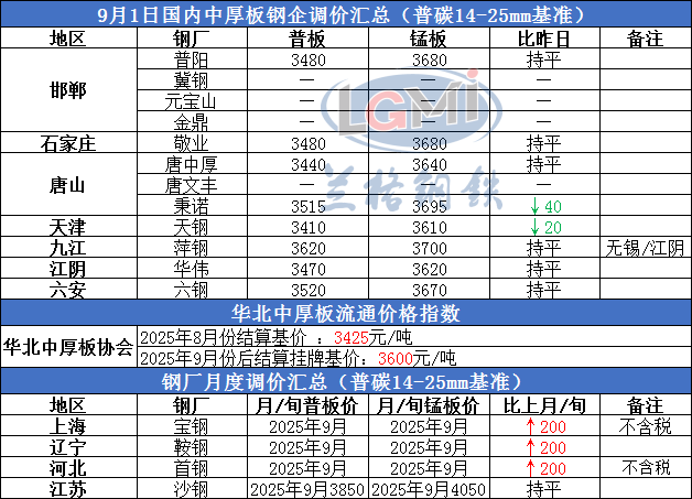 9月1日国内中厚板钢企调价汇总