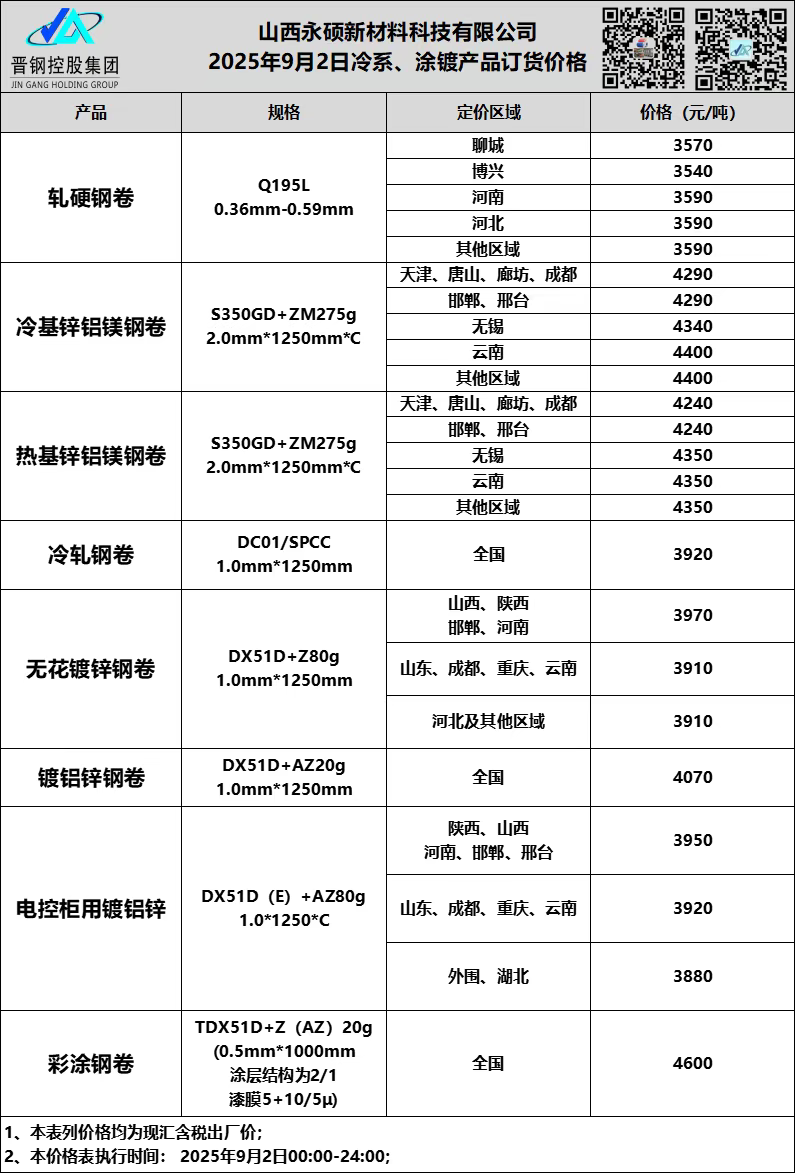 9月2日山西晋钢冷系 涂镀订货价格