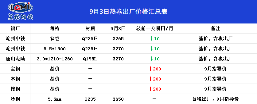 9月3日热卷出厂价格汇总