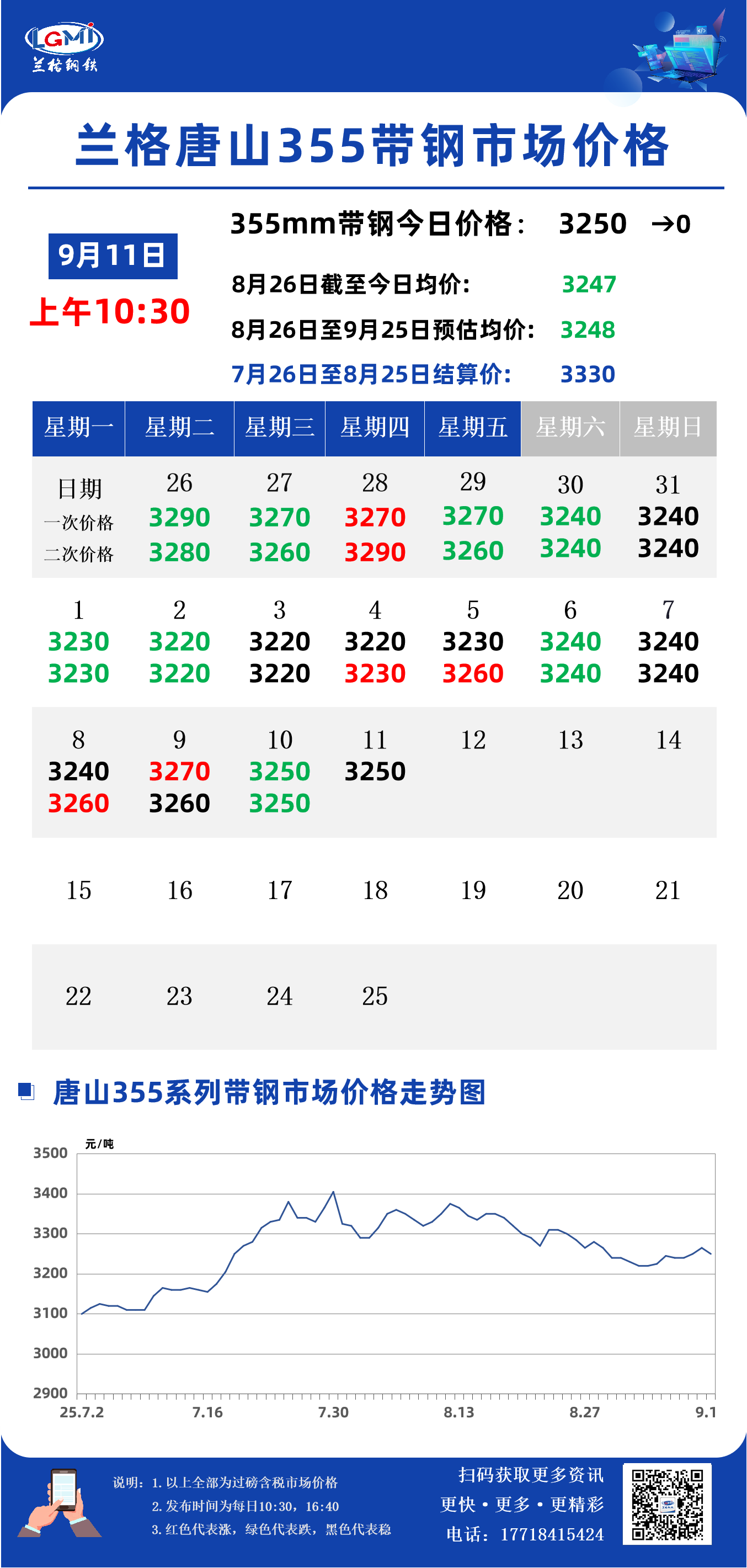 据兰格钢铁云商平台监测数据显示,截至9月11日10:30,唐山地区355系列带钢市场价格为3250元,较昨日市场收盘价格稳。