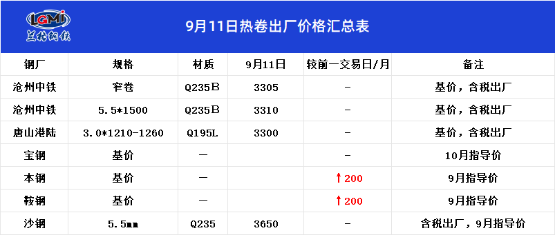 • 9月11日热卷出厂价格汇总