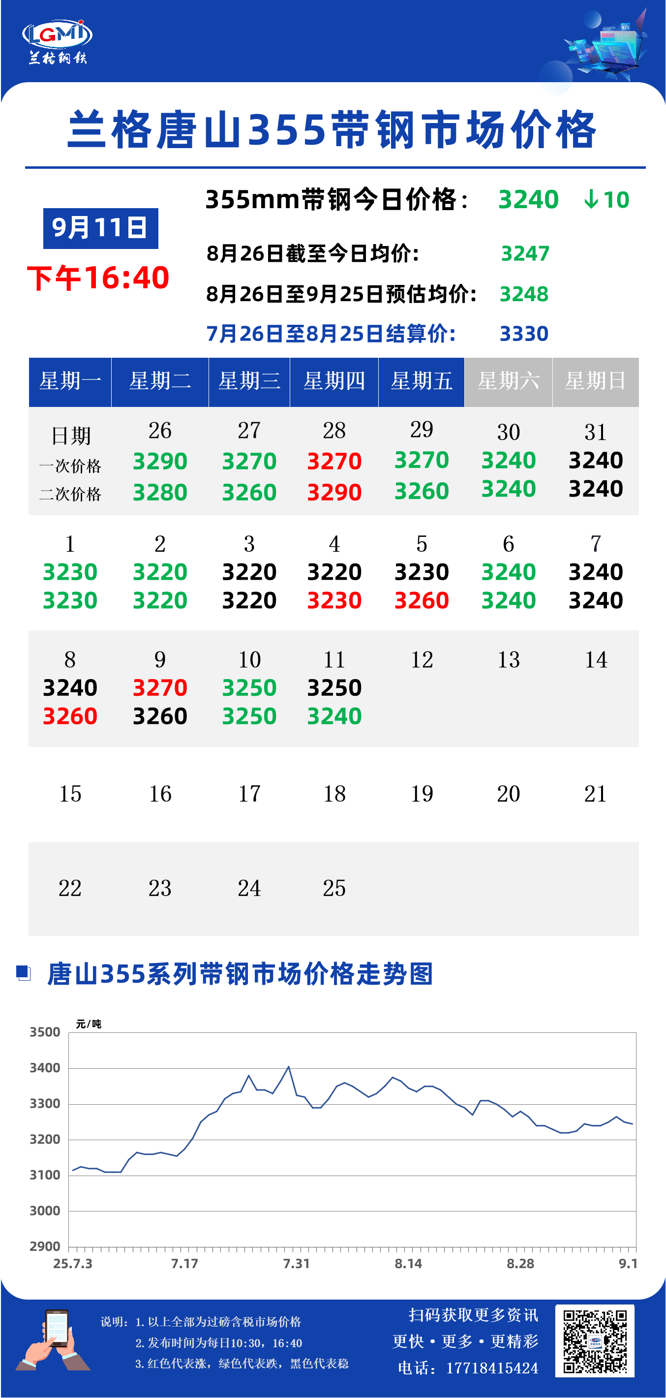 据兰格钢铁云商平台监测数据显示,截至9月11日16:40,唐山地区355系列带钢市场价格为3240元,较早盘价格跌10元,较昨日市场收盘价格跌10元。