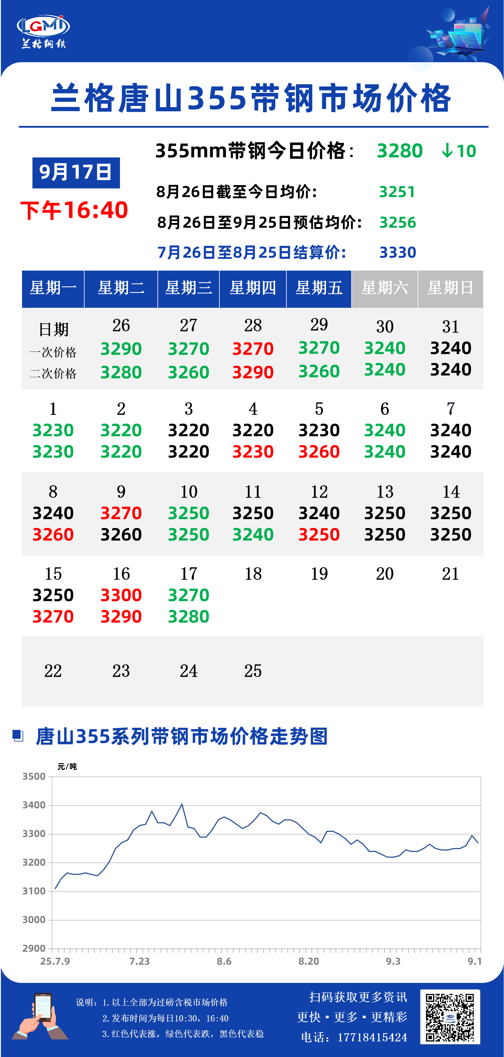 据兰格钢铁云商平台监测数据显示,截至9月17日16:40,唐山地区355系列带钢市场价格为3280元,较早盘价格涨10元,较昨日市场收盘价格跌10元。