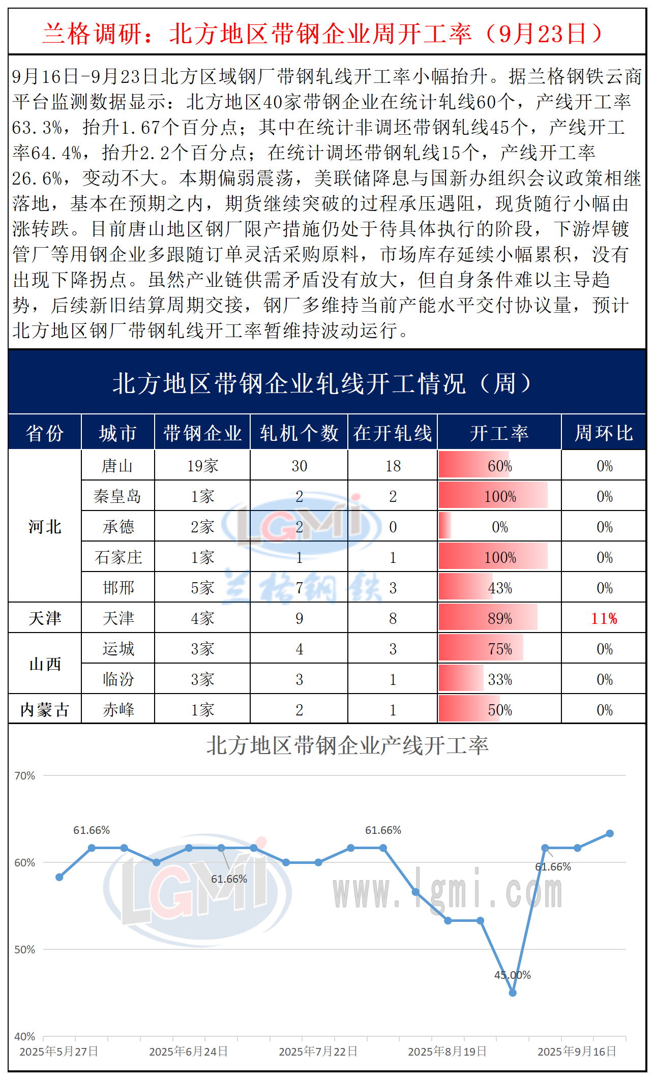 兰格调研:北方地区带钢企业周开工率(9月23日)