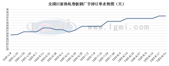 国内热卷生产企业手持订单天数均值为33天,环比上周持平。具体来看,一线企业手持订单天数保持在30天左右,二线企业基本保持在15-25天。