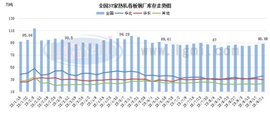 据兰格钢铁网统计,本周全国热卷样本钢厂库存量88.88万吨,环比增加1.71万吨,从数据来看,钢厂库存总量延续了上周的增长态势,其中华北地区厂库增加幅度较大,主要受部分钢厂检修结束后产量释放,但本地需求恢复缓慢影响,按照当前市场供求结构来看,若后期市场需求端未能出现明显改善,钢厂库存量将有进一步积累的趋势。