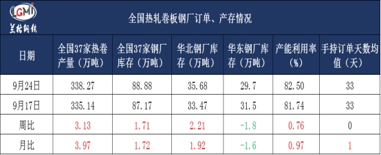 截止9月24日,兰格钢铁网监测的全国热卷钢厂主要指标显示,本周国内热卷总产量及钢厂库存量相比上周同期呈现小幅增长的趋势。追踪国内37家热卷企业本周热卷总产量约338.27万吨,环比上周同期增长3.13万吨;热卷轧线产能利用率82.5%,环比上周上升0.76个百分点;样本钢厂库存量约为88.88万吨,环比上周增加1.71万吨。 目前手持订单情况总体表现为良,长协订单33天,环比上周持平:一线企业手持订单天数保持在30天左右,二线企业基本保持在15-25天。(指标评价-良)。 注:评价指标,仅代表兰格根据关联指标给出的市场晴雨表推荐参考,分优、良、一般、低,四个档位。