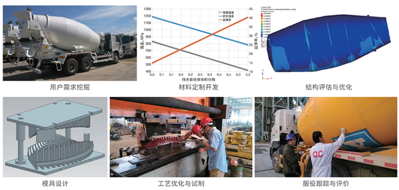 宝钢针对混凝土搅拌车的制造流程和服役特点,打造包含材料、设计、制造和服役评估的全流程贯穿性技术,定制开发全球首发产品BW300TP,加速推进产业升级。
