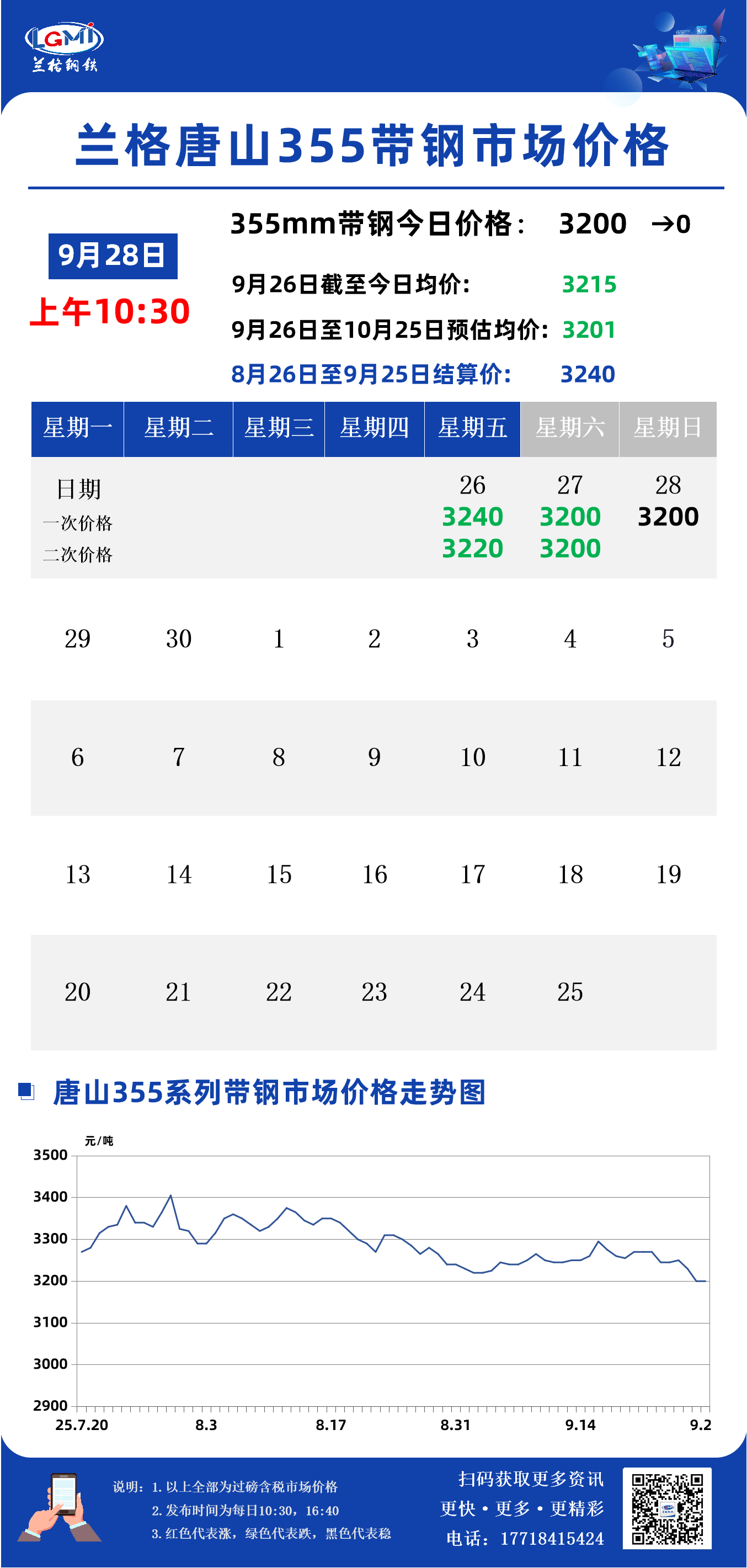 据兰格钢铁云商平台监测数据显示,截至9月28日10:30,唐山地区355系列带钢市场价格为3200元,较昨日市场收盘价格稳。