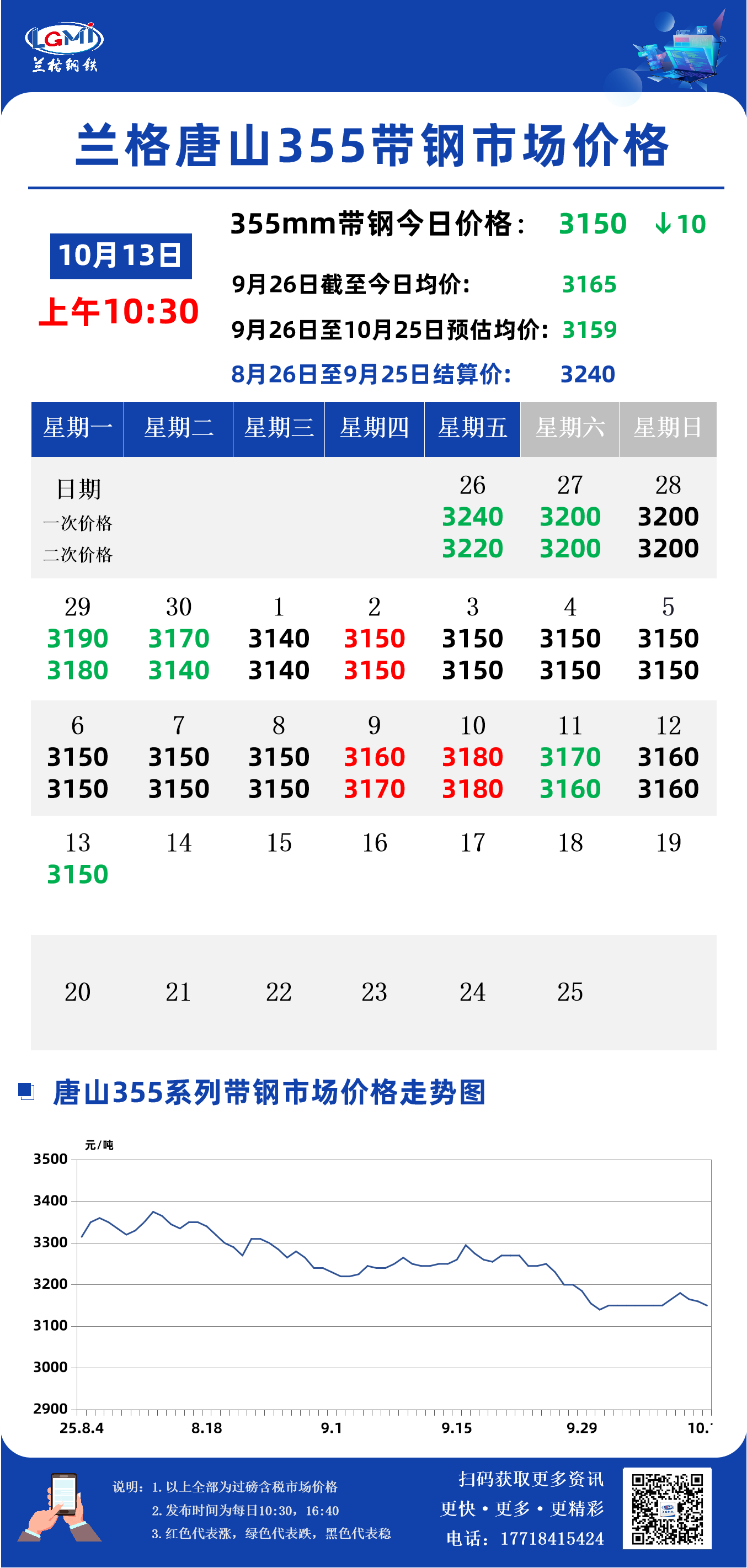 据兰格钢铁云商平台监测数据显示,截至10月13日10:30,唐山地区355系列带钢市场价格为3150元,较昨日市场收盘价格跌10元。