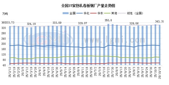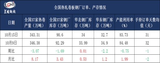 截止10月15日,兰格钢铁网监测的全国热卷钢厂主要指标显示,国内热卷总产量库存钢厂库存量阶段性呈现下降趋势,部分钢厂为应对市场变化,适当调整了生产节奏。追踪国内37家热卷企业本周热卷总产量约343.31万吨,环比上周同期减少3.07万吨;热卷轧线产能利用率83.73%,环比上周下浮0.75个百分点;样本钢厂库存量约为90.6万吨,环比上周下降1.69万吨。 目前手持订单情况总体表现为良,长协订单31天,环比上周小幅减少1天:一线企业手持订单天数保持在30天左右,二线企业基本保持在15-25天。(指标评价-良)。 注:评价指标,仅代表兰格根据关联指标给出的市场晴雨表推荐参考,分优、良、一般、低,四个档位。