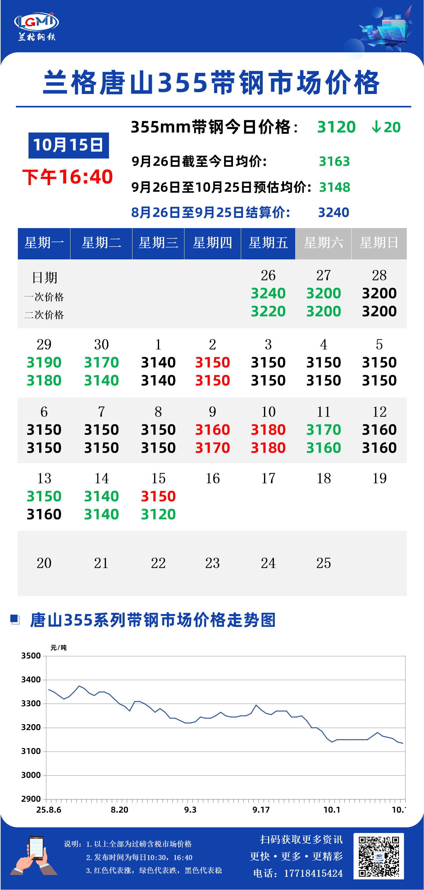 据兰格钢铁云商平台监测数据显示,截至10月15日16:40,唐山地区355系列带钢市场价格为3120元,较早盘价格跌30元,较昨日市场收盘价格跌20元。