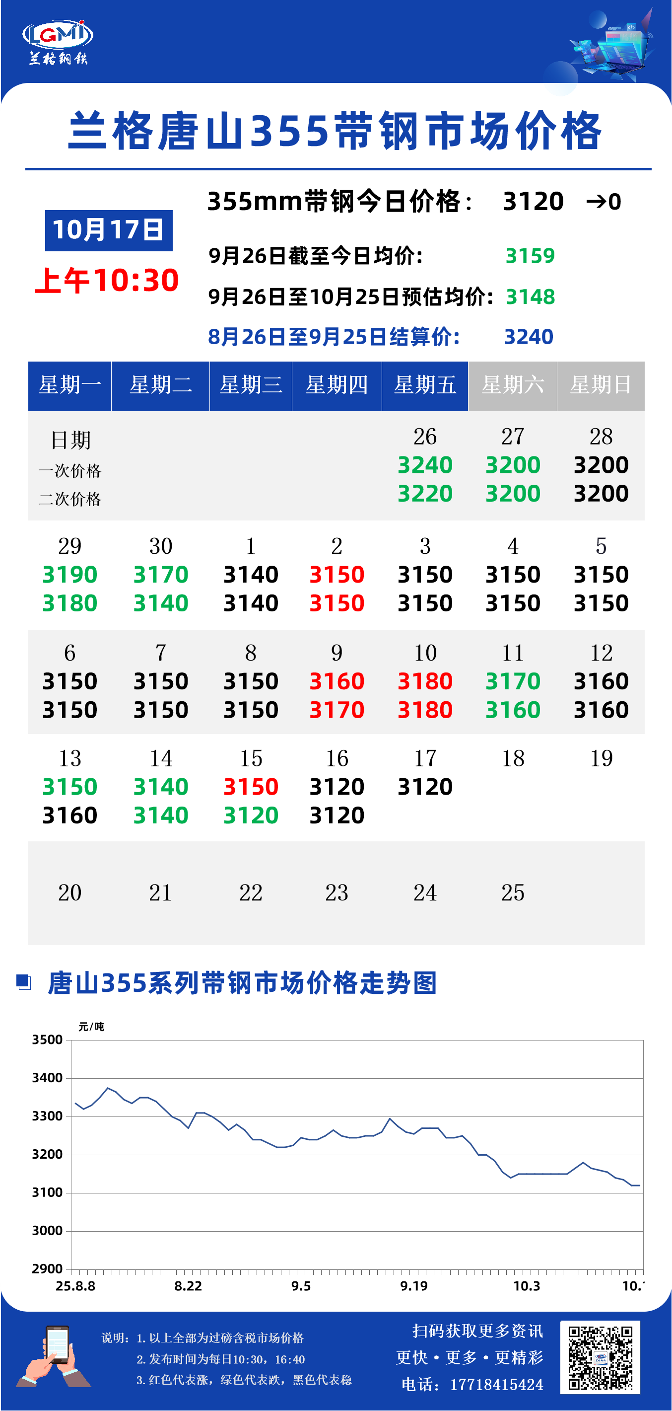 据兰格钢铁云商平台监测数据显示,截至10月17日10:30,唐山地区355系列带钢市场价格为3120元,较昨日市场收盘价格稳。
