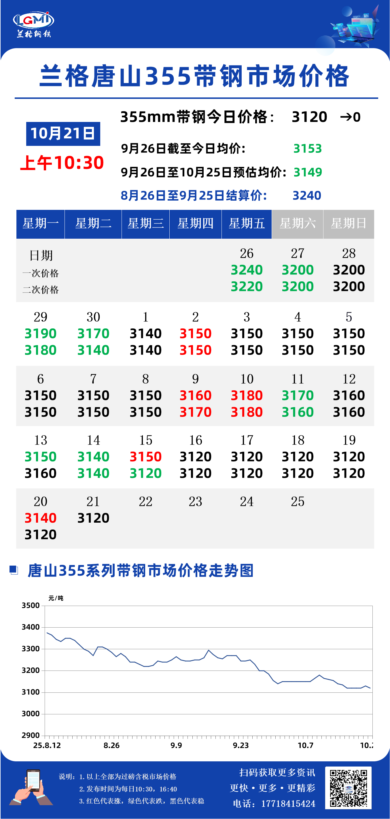 据兰格钢铁云商平台监测数据显示,截至10月21日10:30,唐山地区355系列带钢市场价格为3120元,较昨日市场收盘价格稳。