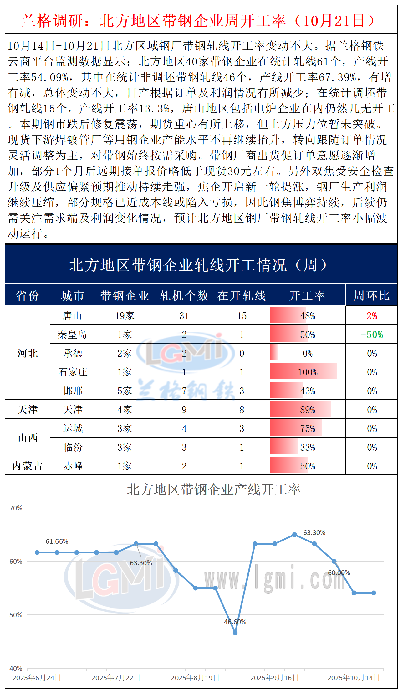 兰格调研:北方地区带钢企业周开工率(10月21日)