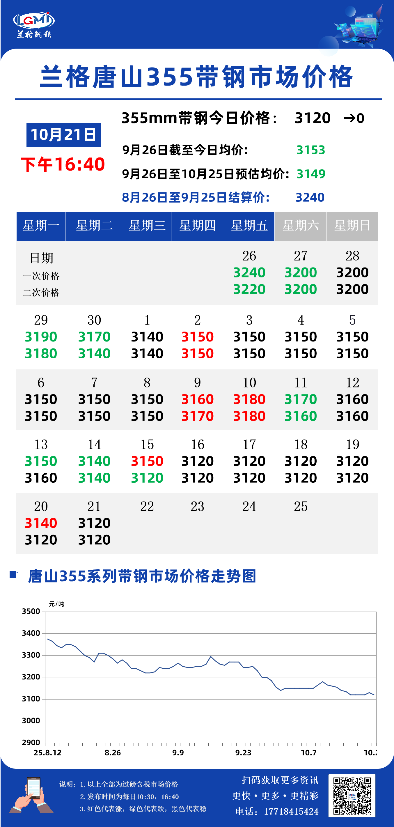 据兰格钢铁云商平台监测数据显示,截至10月21日16:40,唐山地区355系列带钢市场价格为3120元,较早盘价格稳,较昨日市场收盘价格稳。