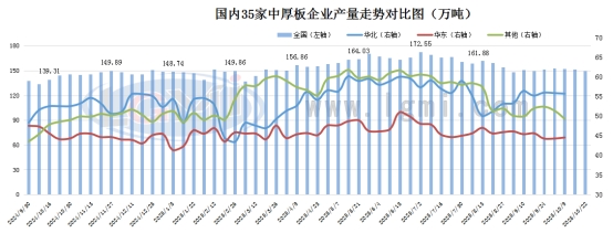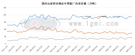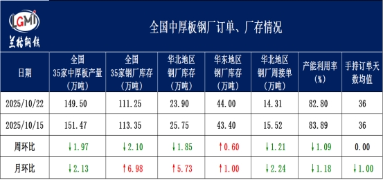 注:评价指标,仅代表兰格根据关联指标给出的市场晴雨表推荐参考,分优、良、一般、低,四个档位。 以下为具体指标表现情况: 10月22日,全国中厚板35家样本企业周产量为149.5万吨(44家新样本钢厂周产量为199.83万吨),环比上周同期减少1.97万吨,轧线产能利用率为82.8%,环比上期下浮1.09个百分点,截止目前样本钢厂20条轧线未满产,6条轧线处于停产状态。从数据可见,近期国内中厚板资源到货小幅下降,但整体仍处于相对高位,市场供应压力虽有所缓解,但仍不容小觑,尤其是随着北方市场受限于季节性因素,下游需求或将进一步萎缩,这对中厚板市场的后续走势构成了不利影响。