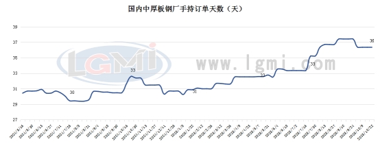 10月22日,本周国内钢企手持订单变化不大,总体表现为良:一线企业手持订单天数保持在30-90天左右,二线企业基本保持在25-35天。近期各地中厚板市场需求表现一般,虽有部分品种需求较好,但大多表现偏弱,钢厂按照需求定制排产计划,排产期表现平稳钢。