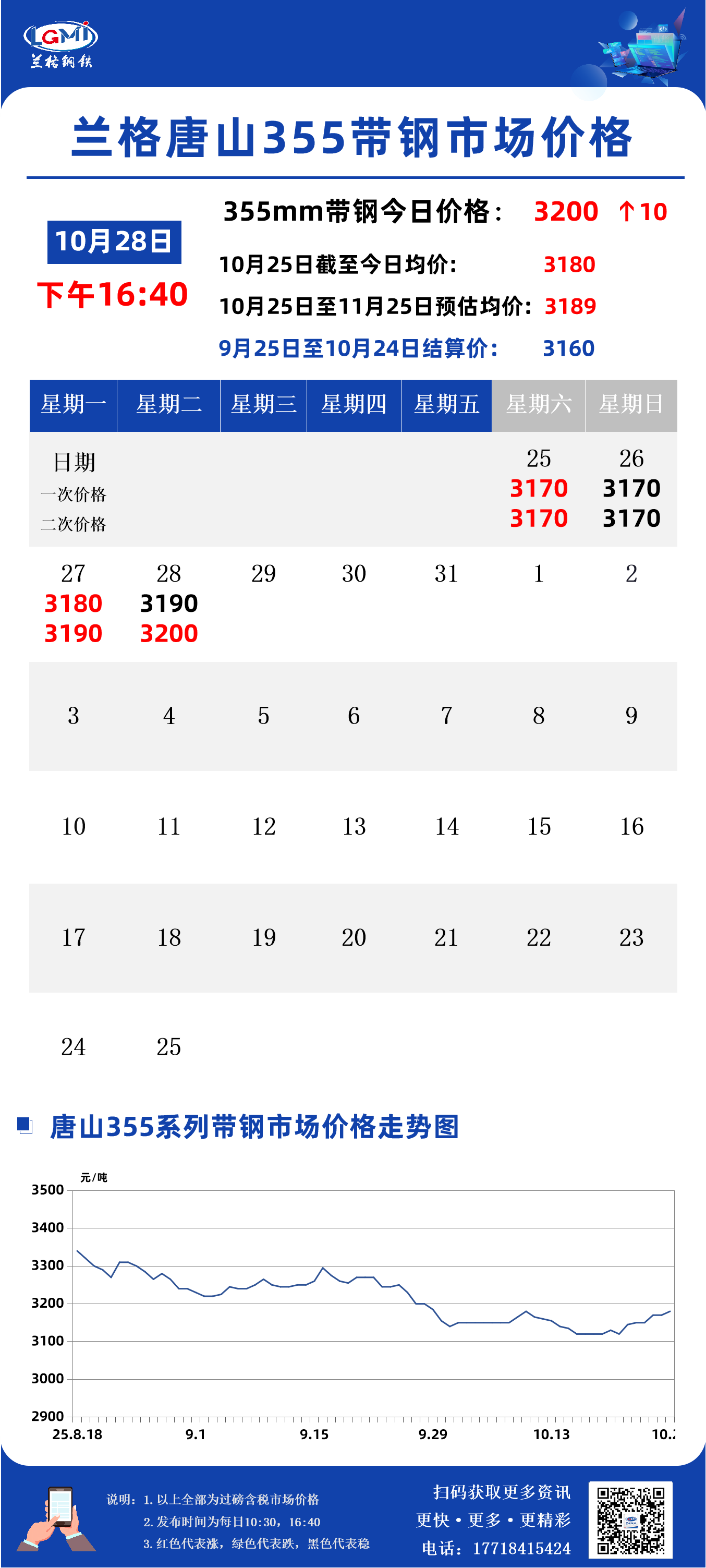 据兰格钢铁云商平台监测数据显示,截至10月28日16:40,唐山地区355系列带钢市场价格为3200元,较早盘价格涨10元,较昨日市场收盘价格涨10元。